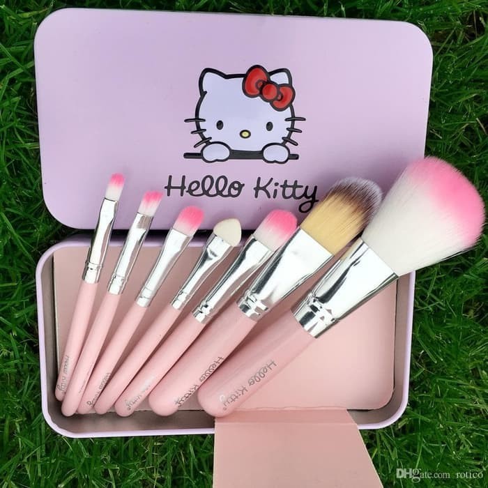 ello Kitty Make Up BrushIsi 7 pcs kuasKemasan kaleng, warna pinkREADY STOCKSet terdiri dari 7 buah kuas yaitu :- Face brush ~ bisa untuk kuas bedak- Foundation brush- Lip brush- Shader brush- Eyeshadow brush- Angled eyeliner- Eye shades stick
