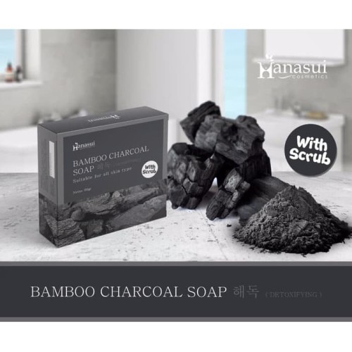 Hanasui Bamboo Charcoal Scrub Soap í•´ë…Sabun yang mengandung campuran Arang Bamboo Hitam yang mampu menyegarkan kulit yang kusam dan merevitalisasi kulit sehingga tampak lebih sehat. Busa yang melimpah berfungsi membersihkan seluruh permukaan tubuh dan disertai dengan scrub halus untuk mengangkat sel kulit mati. Cocok untuk semua jenis kulit.