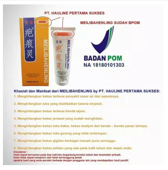 Meilibahenling adalah obat penghilang bekas jerawat dan luka yang sangat banyak digunakan saat ini. Segala macam bekas luka baik luka baru maupun luka lama yang sudah bertahun-tahun juga akan hilang dengan cepat. Penghilang bekas luka ini terbuat dari 100% bahan alami ramuan China yang dikemas dengan bentuk lotion, sehingga tidak berbau obat. Formula baru dengan komposisi minyak ular yang sudah dikenal lama untuk menghaluskan kulit, menghilangkan bekas luka, dan bagus juga untuk luka kena panas seperti luka terkena air panas atau luka terkena knalpot.
