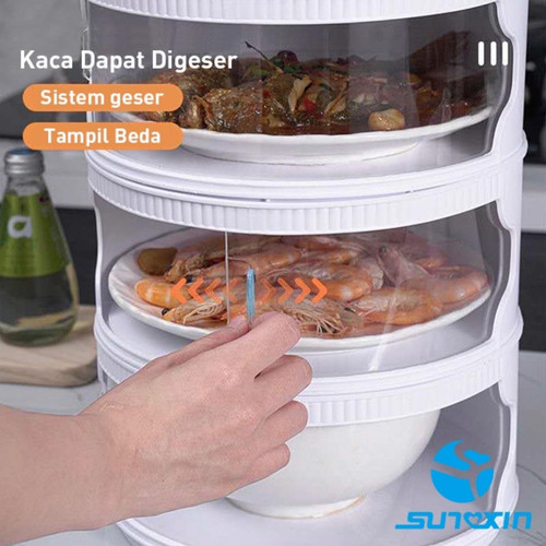 Fitur :- terbuat dari bahan berkualitas tinggi.- Ramah lingkungan,- Tahan lama dan mudah dibersihkan.Desain : transparan sehingga makanannya terlihat dari luar.Berguna dan efektif: mencegah debu kotor dan makanan lain mengkontaminasi, secara efektif mengunci suhu makanan yang lezat menjadi lebih tahan lama dan cerah, dan membiarkan keluarga makan makanan yang lezat.Spesifikasi:Bahan : PET BerkualitasWarna: Transparan