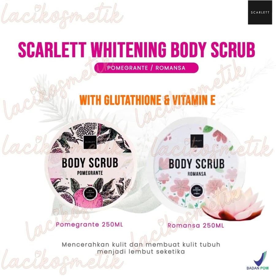 SCARLETT Brightening Whitening Body Scrub 250ml (Lulur Badan) - PomegranteDibuat khusus untuk kamu yang ingin mencerahkan kulit tubuh secara lebih maksimal, mengandung Glutathione (vitamin pencerah kulit paling cepat di dunia) dan butiran Vitamin E. Juga terdapat butiran scrub yang mampu menghidrasi kulit, mengangkat sel kulit mati dan kotoran yang ada di kulit tubuhmu agar menjadi lebih lembut.