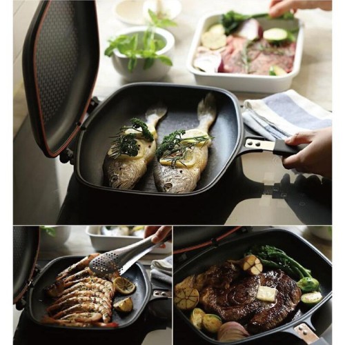 berbentuk pan dua sisi yang terbuat dari bahan anti lengket, dilengkapi dengan seal anti tumpah, dan memiliki pegangan yang panjang untuk memudahkan penggunaan. Alat masak ini merupakan solusi untuk Toppers yang tidak jago memasak karena pan ini bisa digunakan untuk menumis, memanggang hingga mengukus dengan sangat mudah. Yang sedang diet, Happy Call bisa digunakan untuk memasak tanpa minyak atau dengan minyak yang sangat sedikit. Dengan alat masak canggih ini, kamu juga tidak perlu takut lagi terkena cipratan minyak panas ketika memasak karena desain double pan-nya.Spesifikasi:1. Sistem Pengunci Magnetik (magnetic locking mechanism /handle)2. Pegangan Stainless Steel (stainless steel holder)3. Karet Segel Silicon (silicon seal packing)4. Tempat penampung minyak /uap air5. Engsel Penahan (hinge joint /oil receptacle)6. Lubang uap (steam vent /port)7. Alur menonjol (grooved rim)8. Gagang Anti Panas (controured head resistant handle)> Ukuran Diameter Teflon 28cmx22cmDouble Pan memiliki 2 sisi permukaan untuk memasak dengan gagang bermagnetik, hingga:* Menghasilkan pressure tinggi, proses masak menjadi lebih cepat 30-40%* Tidak tumpah saat masakan dibolak-balik* Hasil Optimal &Maksimal, olahan ikan dan daging terasa lembut didalam dan crispy diluarManfaat Double Pan antara lain:* Memanggang ikan, udang, aneka seafood, steak, sate, martabak, pizza, cake.* Mengolah nasi goreng dari beras, aneka tumis sayuran hingga popcorn dengan sempurna.* Dapur bersih bebas percikan minyak.Tanpa asap dan bau.* Dilengkapi dengan tiga lapisan keramik special ceratinum coating menjadikan permukaan bebas lengket, hanya membutuhkan sedikit minyak. Kuat dan tahan lama serta mudah dibersihkan.* Mengatasi problem memasak ikan! (tanpa percikan minyak)* Sajian lebih nikmat dan kaya giziDapatkan harga menarik pembelian 1pcs sudah Harga partai grosir!!!