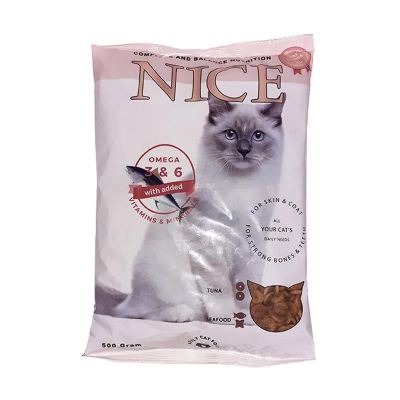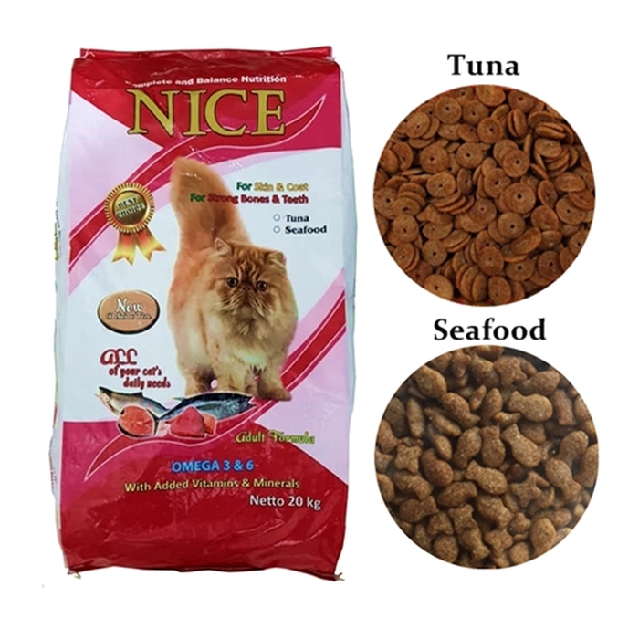 Makanan kucing merk Nice merupakan makanan kucing yg mengandung protein 28% serta aroma khas seafood sehingga mengundang selera makan kucing Anda.