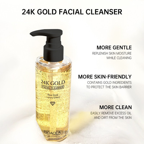 BIOAQUA 24K Gold Facial Cleanser 200mlBPOM Approved ✅ NA11211200732-More gentleReplenish skin moisture while cleaning-More skin-friendlyContains gold ingredients to protect the skin barrier-More cleanEasily remove excess oil and dirt from the skin-Neutral pHCare for the skinHOW TO USEEasy to bubble and washSTEP 1:Take an appropriate amount of cleanser and use moist hands to make a rich latherSTEP 2:Apply the foam to the face and massage gently in circular motionsSTEP 3:Wash your face with clean water
