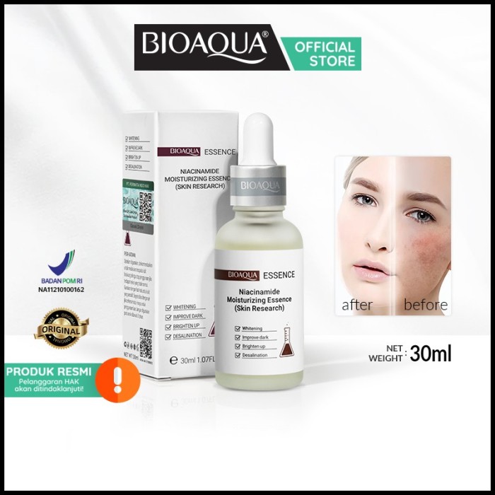 BIOAQUA Niacinamide Moisturizing Essence (Skin Research) 30mlBPOM Approved ✅ NA11210100162Contains niacinamide, a whitening and brightening ingredient-Improve dull skin-Fade facial spots-Brighten skin colour-Whitening and translucent-Moisturizing and easy to absorbCore ingredients:Nicotinamideã€BetaineBIOAQUA Natural Skin Moisturizing And Acne Care Essence 30mlBPOM Approved ✅ NA11210100117Features:-Repel acneHelp improve acne-Fades acne marksReduce the formation of melanin and diminish black acne marks-Brighten skin colourImprove dullness and uneven skin tone-MoisturizingLong-lasting moisturizing, moisturizing and translucentPlant extraction, safer-forsythia suspensa fruit extract-leonurus sibiricus extract-salvia miltiorrhiza root extract-atractyloides lancea root extract-Propolis ExtractBIOAQUA Hyaluronic Acid Moist Essence 30mlBPOM Approved ✅ NA11210100110Features-Deeply moisturizereplenish moisture for dry and dehydrated skin-Easy to absorbCrystal clear texture, light and easy to absorb