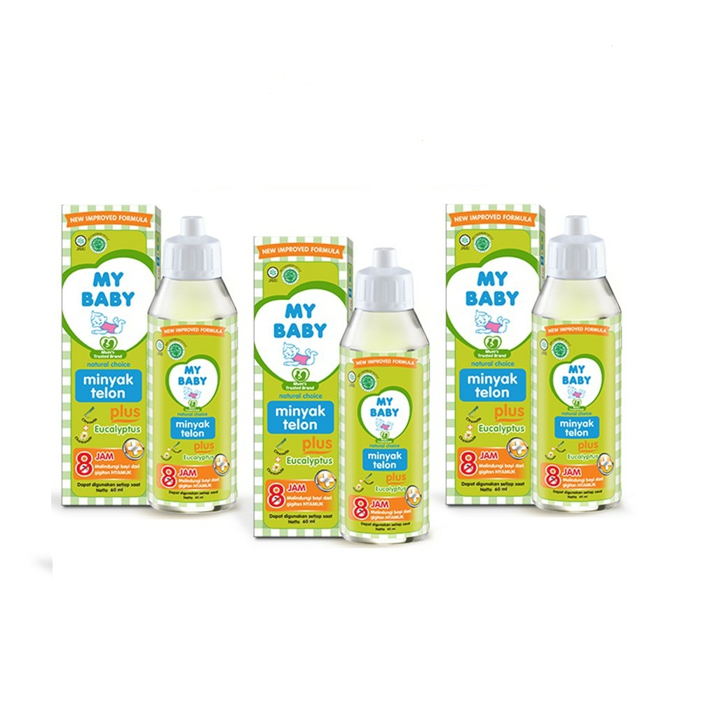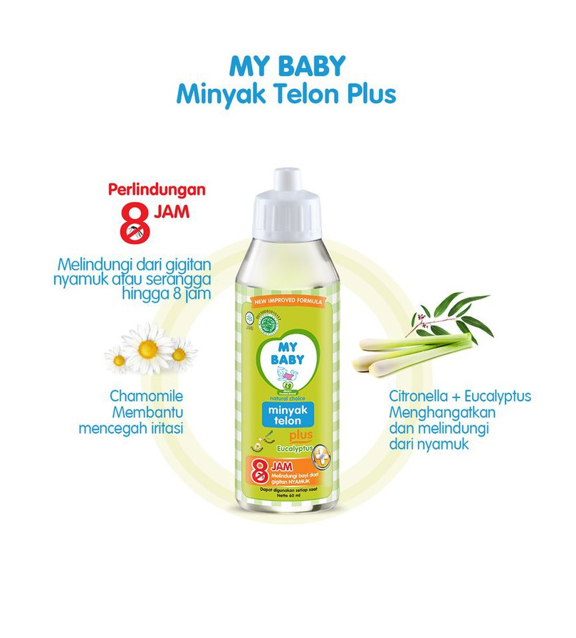 MY BABY Minyak Telon Plus adalah minyak telon yang akan menjaga kehangatan tubuh si kecil. Dibuat dari bahan alami (Eucalyptus, Citronella, dan Chamomile) yang nyaman untuk tubuh bayi. • Aroma menenangkan • Kemasan praktis • Bahan-bahan alami • Halal Manfaat • Menjaga kehangatan tubuh si kecil • Meredakan kembung dan masuk angin • Melindungi dari gigitan nyamuk hingga 8 jam Kelebihan • Aroma menenangkan • Kemasan praktis • Bahan-bahan alami • Menyegarkan • Mudah dibawa dan disimpan Isi : 150mL