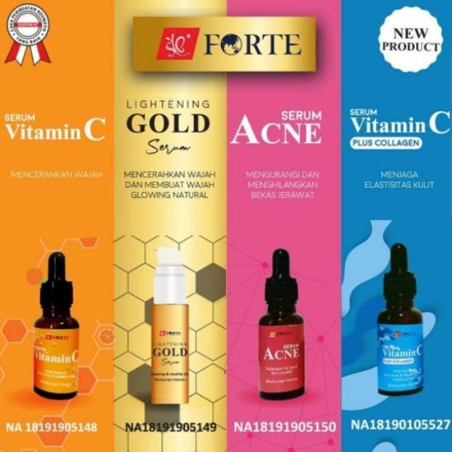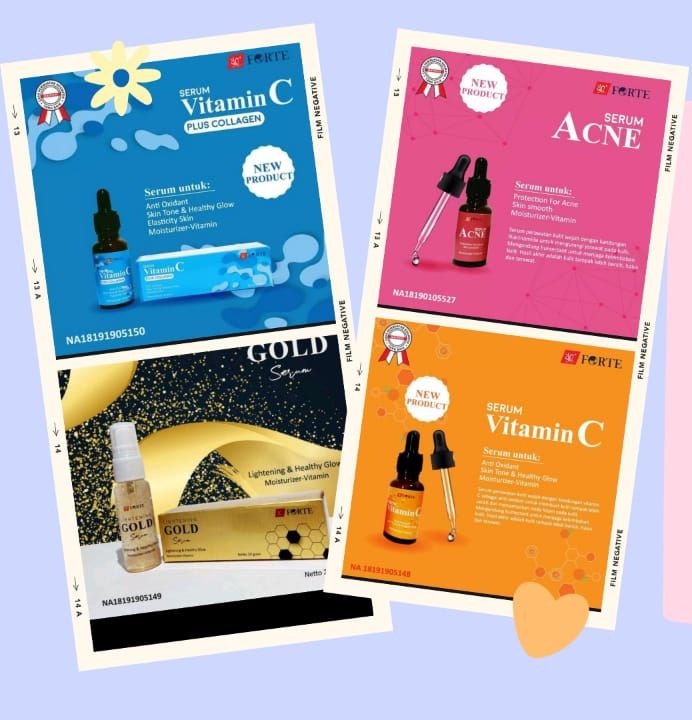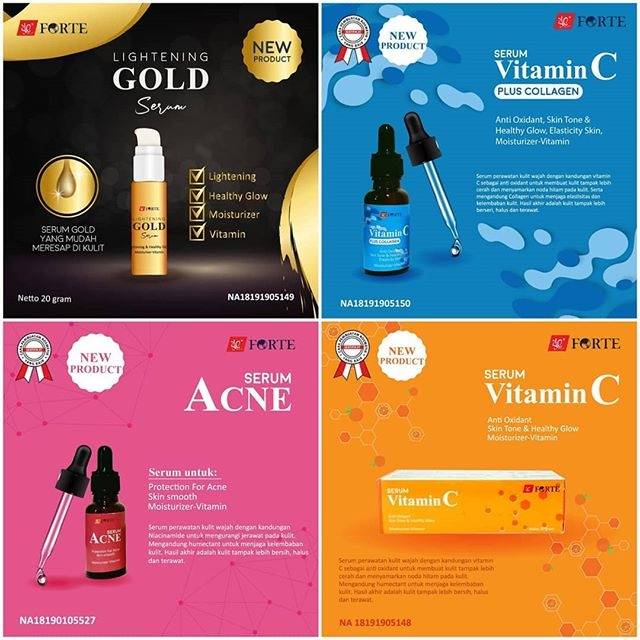[ PAKET LENGKAP] 4pcs FORTE Serum ( Serum Gold + Acne Pink/ Jerawat Pink + Vitamin C Collagen Biru + Vitamin C orange) by FORTE BPOM Serum Perawatan Kulit WAzliah Mulus Bersih - mengatasi jerawat- flek hitam- anti penuan- meratakan - Baya