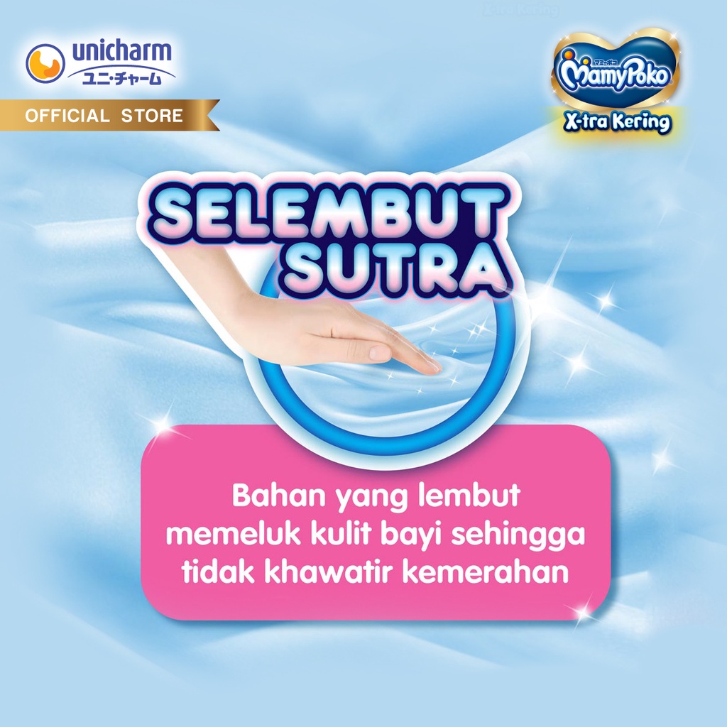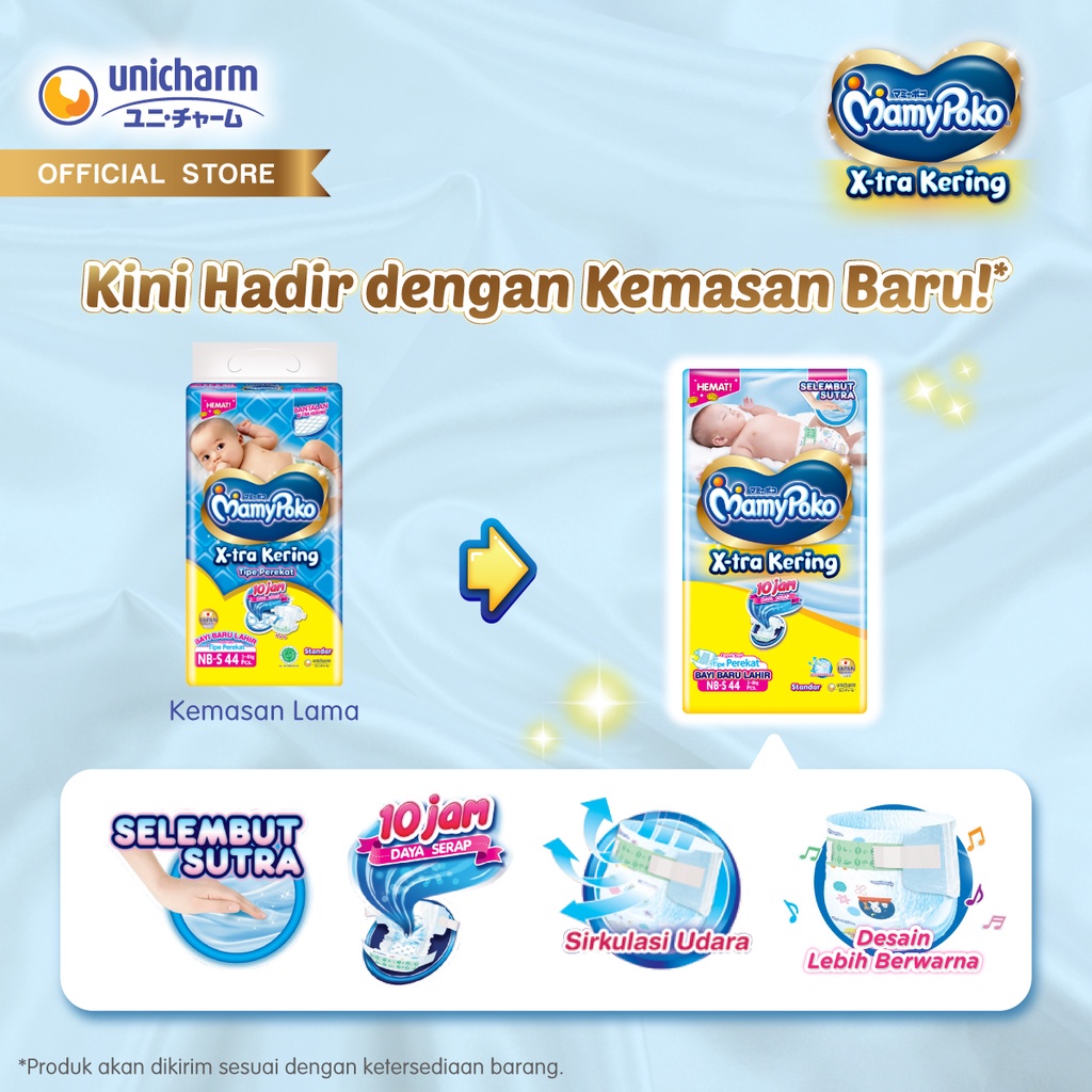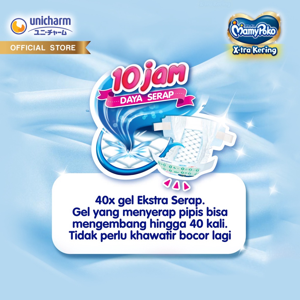 MamyPoko Tipe Perekat X-tra Kering pilihan Mamy untuk menjaga kulit si Kecil tetap kering dan nyaman. Diciptakan dengan lapisan 10 jam daya serap dan 40x gel ekstra serap, sehingga menyerap lebih banyak, lebih cepat kering dan dapat digunakan lebih lama