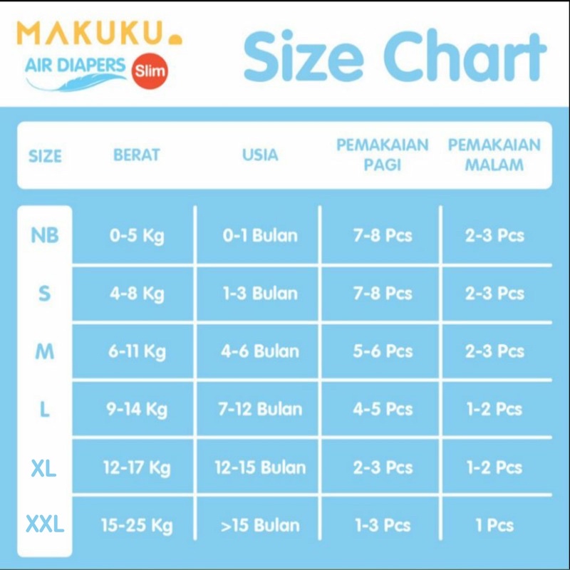 Makuku air diapers comfort+ merupakan produk terbaru makuku kemasan ekonomis. Namun tetap menggunakan inti struktrur bahan 100%SAP yg memiliki fitur anti gumpal yg dapat lebih cepat menyerap cairan sehinggap permukaan diapers tetap kering dan tidak lembab.