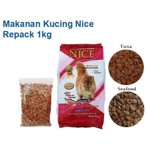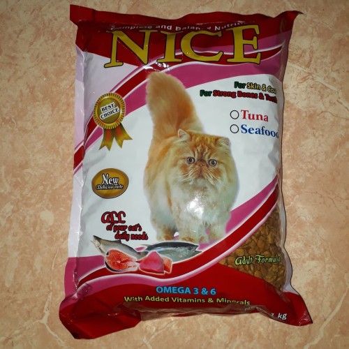 Makanan kucing merk Nice merupakan makanan kucing yg mengandung protein 28% serta aroma khas seafood sehingga mengundang selera makan kucing Anda.
