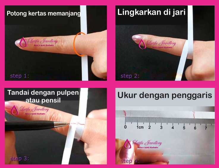 - Cara ukur (lihat di foto) :siapkan benang/ tali, lalu lilitkan ke jari dari ujung tali ketemu ujung lingkaran jari, lalu potong benang / tali, kemudian ukurkan panjang nya di penggaris