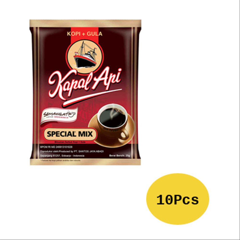Kapal Api Special Mix 10 x 25gKapal Api Special Mix 10 x 25gadalah salah satu kopi sachet yang menjadi kesukaan penikmat kopi di Indonesia. Diracik dari biji kopi pilihan Indonesia dan diolah dengan teknologi mesin kopi modern. Berpadu dengan baik bersama gula murni, menghasilkan kopi sachet tubruk paduan kopi dan gula yang spesial untuk setiap penikmat kopi di Indonesia. Hadir dengan kemasan sachet yang praktis sehingga mudah diseduh di mana saja dan kapan saja. Menjadikannya tetap Kapal Api yang memiliki jargon "jelas leb