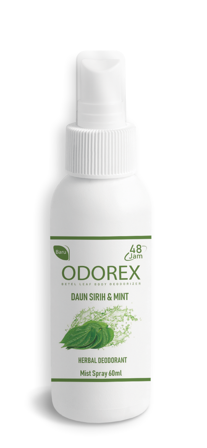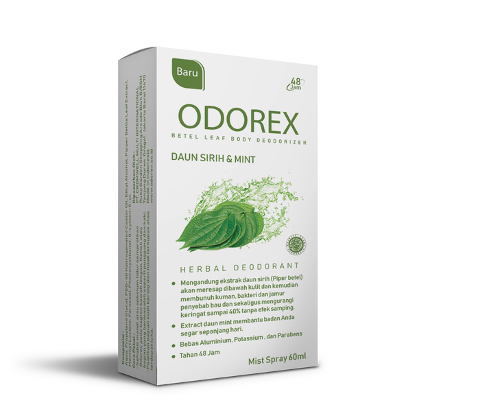 Larutan Odorex mengandung extract daun sirih (Piper betle) akan meresap dibawah kulit dan kemudian membunuh kuman,bakteri dan jamur penyebab bau. Melapisi dan menjaga agar bakteri penyebab bau tidak berkembang lagi dan juga mengurangi keringat sampai 40%.