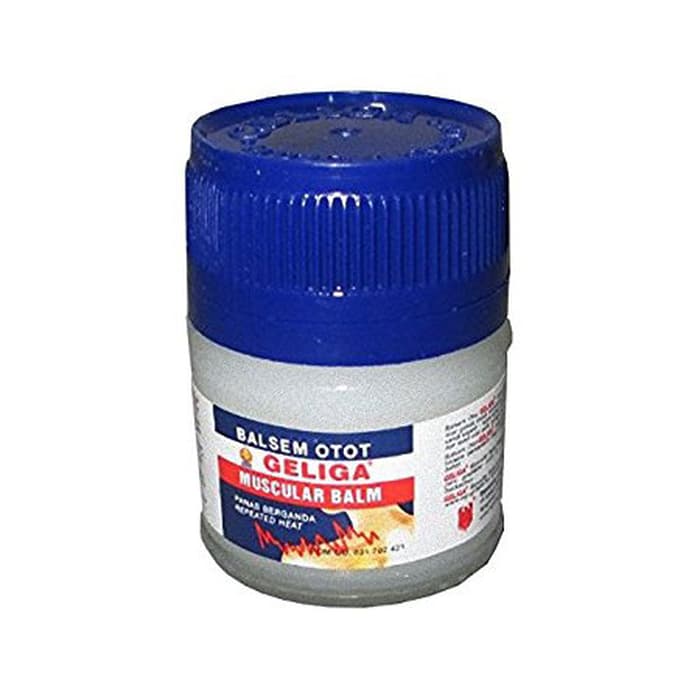 BALSEM OTOT GELIGA Balsem otot GELIGA diformulasikan khusus untuk membantu meredakan Nyeri otot & sendi, seperti : nyeri akibat pukulan / memar , keseleo Pegal - pegal dan nyeri pada otot punggung. Komposisi setiap 1 g mengandung : Methyl Salicylate...........30.00% Peppermint Oil..............18.50% White Camphor Oil........12.50% Base Ad......................100.00% Cara penggunaan : Oleskan Balsem Otot GELIGA secukupnya pada bagian yang sakit, lalu gosok secara merata Dan perlahan. Bila perlu dapat diulang 3 - 4 kali sehari. Untuk hasil maksimal , sesudah 2 - 3 Jam , letakkan handuk panas secara berkala pada bagian yang telah di oleskan. Cara penyimpanan : Simpan di bawah suhu 30 C , tutup dengan rapat dan hindarkan dari sinar matahari.