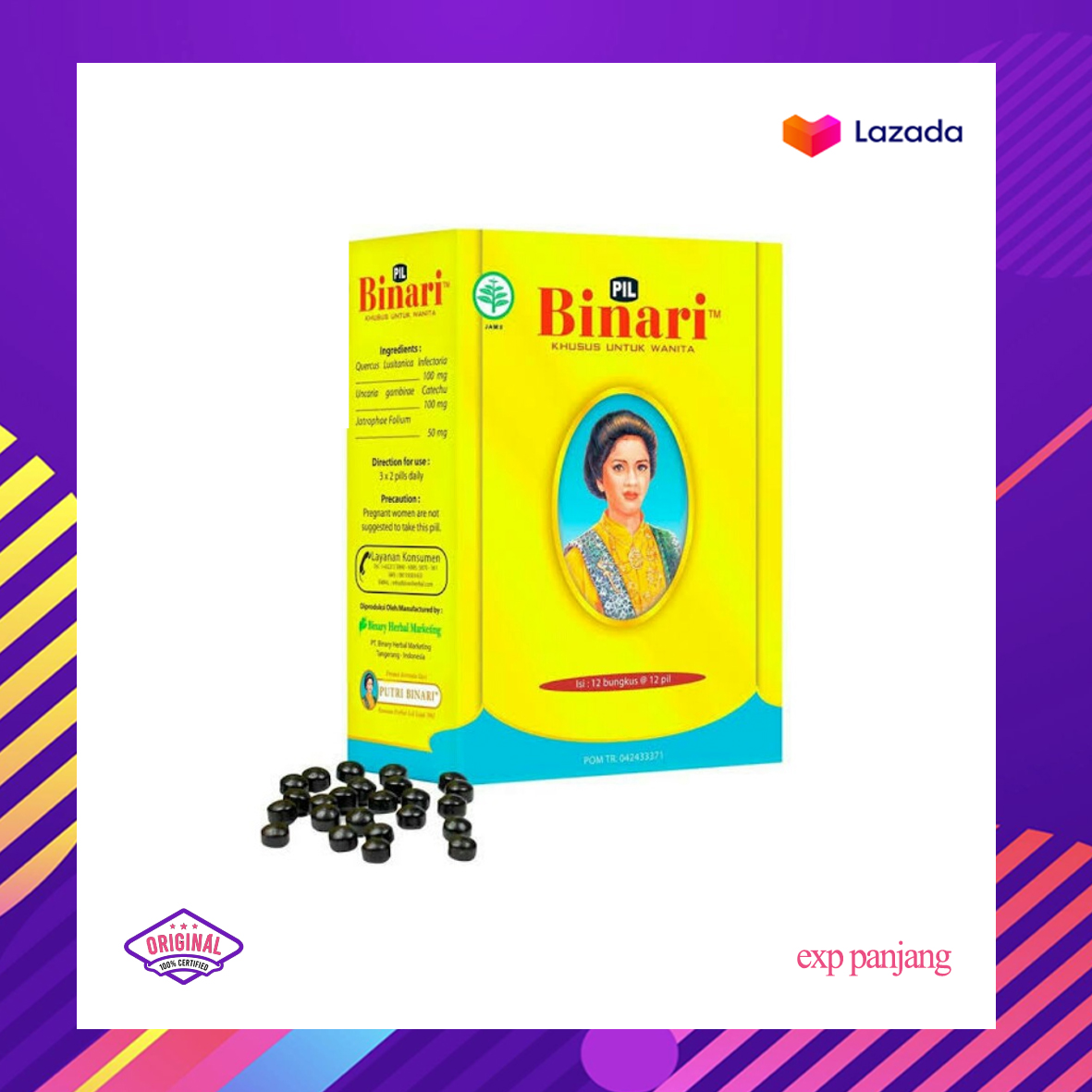 Pil Binariadalahjamu untuk wanita yang mengandung ekstrak herbalQuercus lusitanica infectoria(manjakani),Uncaria gambirae catechu(gambir), danJatrophae Folium.