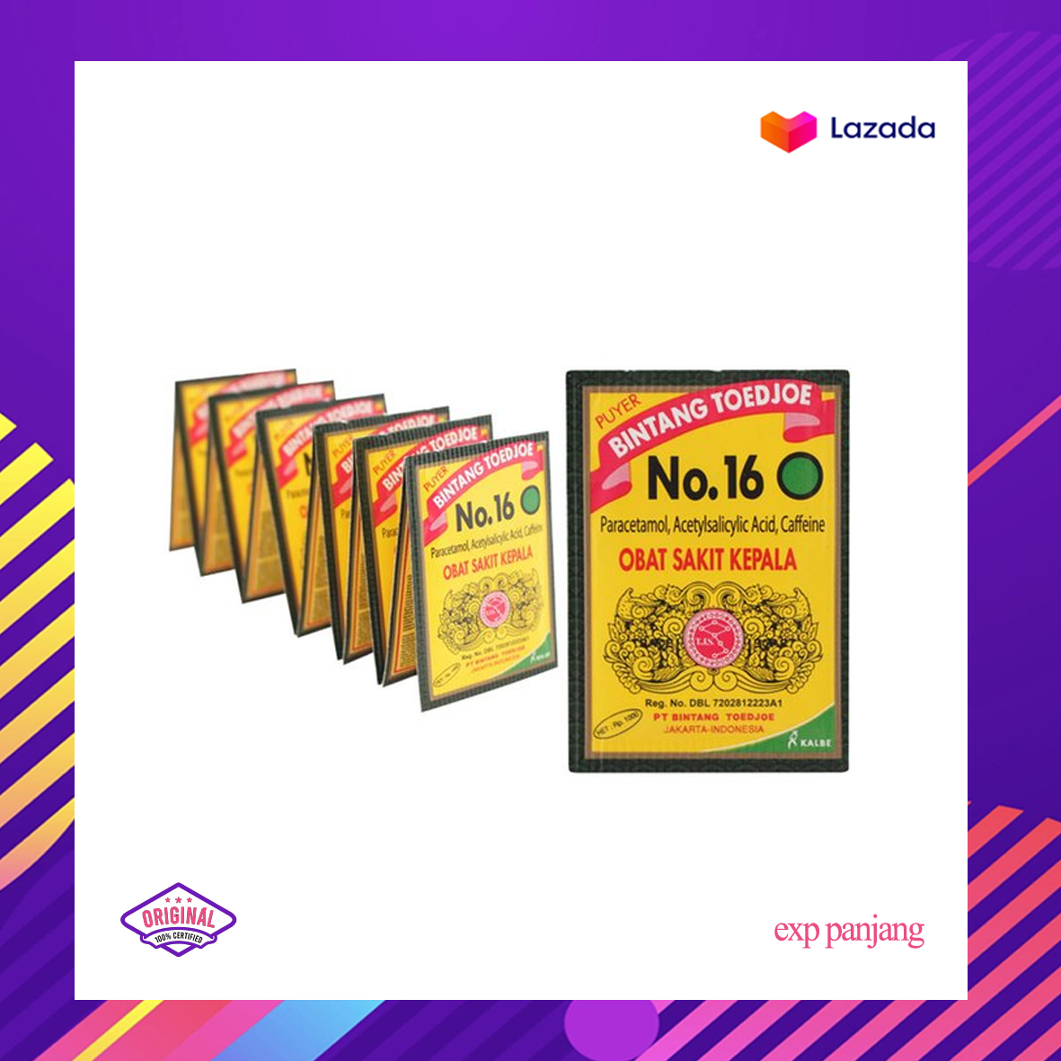 PUYER BINTANG TOEDJOE NO 16 merupakan obat yang mengandung Paracetamol, Acetosal, dan Caffeine. Obat ini digunakan untuk meredakan demam, sakit kepala, sakit gigi, sakit telinga, nyeri haid, dan nyeri ringan lainnya. Paracetamol merupakan analgesik dan antipiretik, Acetosal merupakan golongan obat Anti-Inflamasi Non Steroid (AINS), dan Caffeine merupakan stimulan sistem saraf pusat untuk mencegah rasa kantuk.