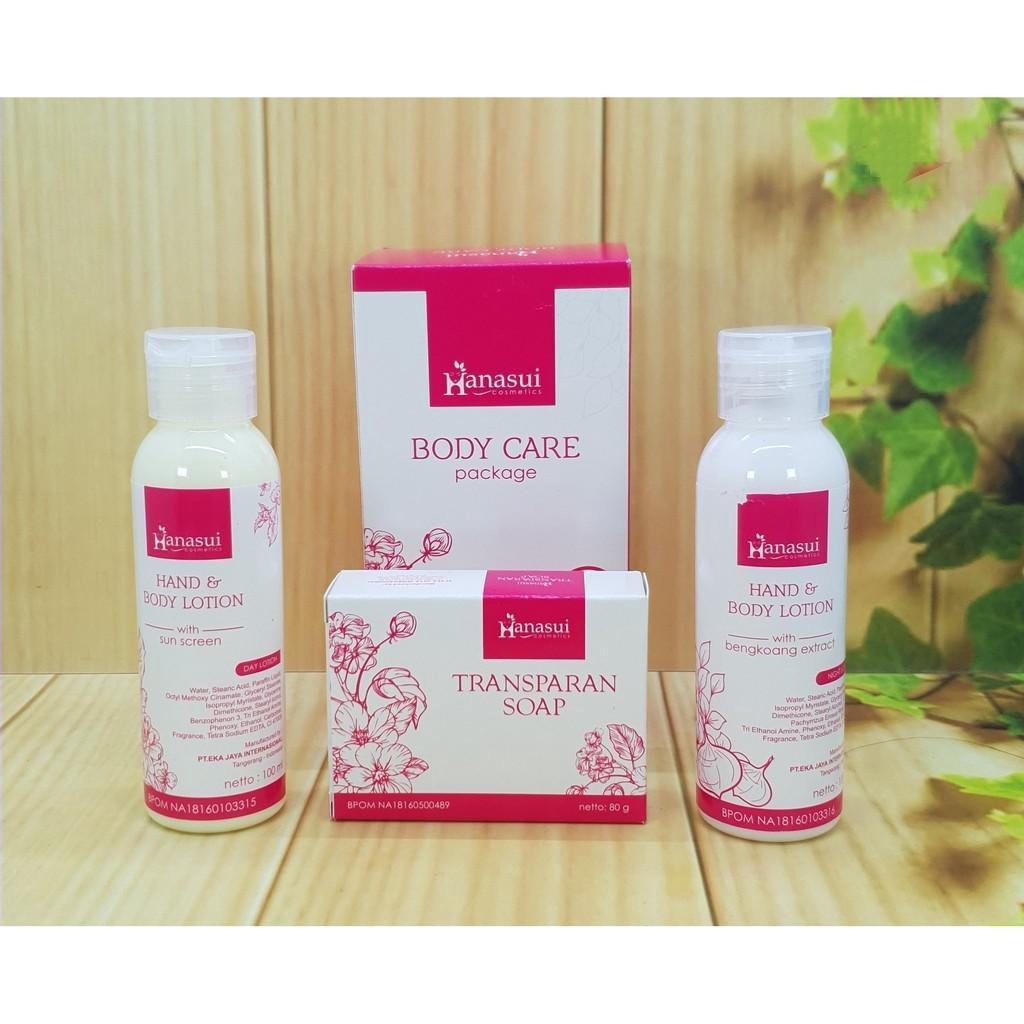 HANASUI selalu sudah teregristrasi BPOM ^^ HANASUI BODY CARE 3IN1 / PAKET LOTION HANASUI / ORIGINAL BPOM Terdiri Dari : 1. Lotion dengan Sun Screen 100ml / BPOM NA18160103315 2. Lotion dengan Bengkoang Extract 100ml / BPOM NA18160103316 3. Transparent Soap 80gr / BPOM NA18160500489