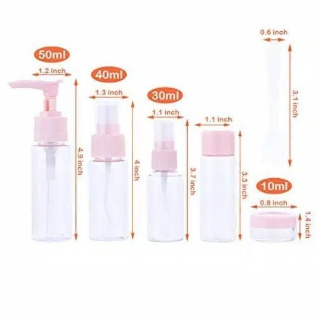 Saat traveling sebisa mungkin anda harus meminimalkan barang bawaan karena jika kelebihan bagasi anda akan dikenakan denda kelebihan bagasi. Saat traveling isi koper pasti bertambah terus diantaranya belanja oleh-oleh. Lalu bagaimana meminimalkan barang bawaan??Cukup mudah, anda dapat meminimalkan perlengkapan mandi dan kosmetik yang hendak dibawa dengan New 6 in 1 Travel Toiletries Kit . Anda dapat menghemat ruang dan berat bagasi.1 Set Botol Traveling 7 in 1 Terdiri Dari:2 botol spray, kapasitas 30 ml dan 40 ml per botol, tiap botol ada tutupnya, bisa untuk tempat parfum, toner wajah.1 botol tuang, kapasitas 10 gram per botol, bisa untuk tempat sabun mandi cair dan shampoo atau conditioner.1 botol pump pencetan, kapasitas 50 ml, bisa untuk tempat sabun wajah atau sabun mandi, dilengkapi klip anti tumpah.1 pouch transparan untuk tempat botol.2 tempat cream 10 ml.Cukup pindahkan kosmetik dan sabun yang dipakai sehari-hari ke dalam botol toiletries kit, bisa untuk pemakaian selama 1 minggu atau lebih. Traveling gak pake repot, benar-benar simply loh...