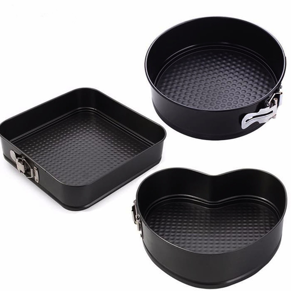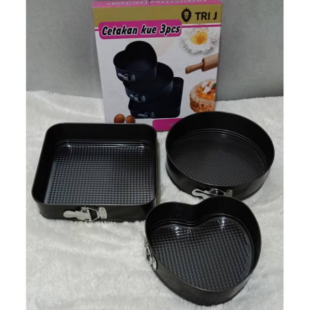 Cetakan Kue 3 Pice Set Teflon Cake Pan Mold terbuat dari bahan alumunium yang dilapisi dengan Teflon Anti Lengket. Satu set Cetakan kue ini terdiri dari 3 motif sebagai berikut :- Bentuk Love Ukuran 20Cm- Bentuk Lingkaran Ukuran 25Cm- Betuk Persegi Ukuran 28Cmtinggi 6.5cmCetaka kue ini selain anti lengket juga didesain sangat praktis dilengkapi dengan pengunci pada bagian sisinya sehingga dapat dilepas dengan mudah