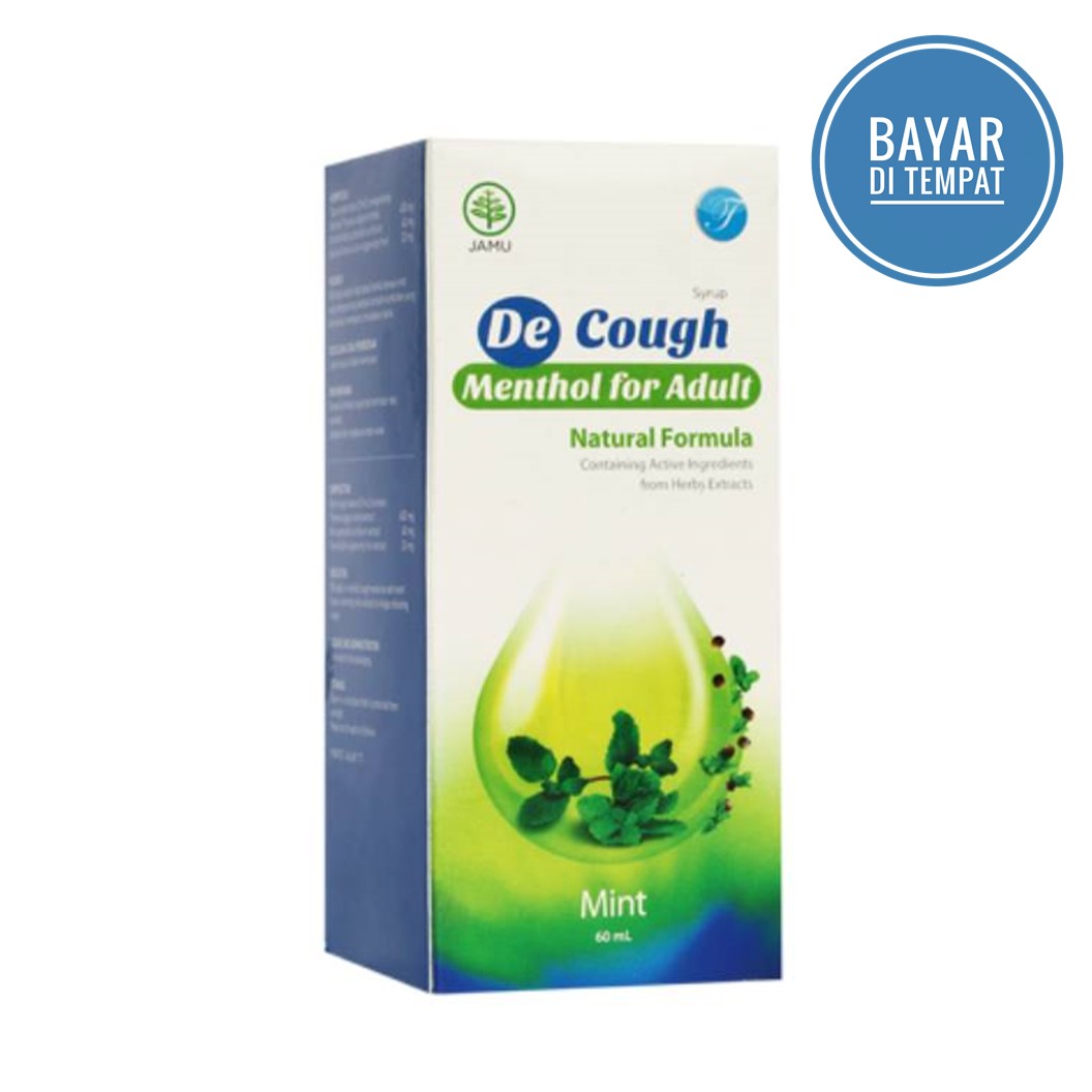 Isi 60 mlDe Cough adalah obat batuk herbal berasa jeruk yang mengandung ekstrak tumbuh-tumbuhan yang berkhasiat untuk membantu meredakan batuk.Formula herbal yang terkandung dalam obat ini tiap sendok teh (5 ml) antara lain: Thymi herba ekstrak 200 mg, Abri folium ekstrak 20 mg, Oleum foeniculi 3 mg, Oleum menthae piperitae 3 mg.KHASIATThymi herba berkhasiat untuk :Antiseptik, yaitu membunuh bakteri penyebab batuk.Antitusif, yaitu meredakan batuk.Ekspektoran, yaitu mengencerkan dahak yang kental sehingga mudah dikeluarkan.Sekretomotor, yaitu mengeluarkan dahak dari saluran napas.Daun saga berkhasiat untuk :Ekspektoran, yaitu mengencerkan dahak yang kental sehingga mudah dikeluarkan.Anti virus, yaitu membunuh virus penyebab batuk.Minyak adas berkhasiat untuk :Ekspektoran, yaitu mengencerkan dahak yang kental sehingga mudah dikeluarkan.Memberi rasa enak pada sirup DeCough.CARA PEMAKAIAN :Anak 1 6 tahun : tiga kali 2 3 sendok makan per hari.Anak > 6 tahun & Dewasa : tiga kali 2 3 sendok makan per hari.