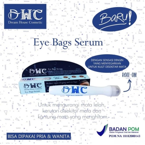 Dhc eyebags serum bpomNetto 6.5 mlAman Di Pakai Untuk Area SensitifSerum Perawatan Kulit di Sekitar mata khususnya untuk kantong mata yang dapat mengurangi garis-garis kerut disekitar mata dan membuat kulit mata akan dapat tersamarkan. Pemakaian rutin akan membuat kantong mata dan kerutan semakin memudar.Lingkar mata akibat lelah kurang tidur, kerja di depan komputer & HP atau akibat penuaan kini nggak usah bingung lagi ya Dream House Cosmetic BY SYB mengeluarkan produk baru dan unik. Dengan Cara Kerja Maksimal dan higienis.Cara kerja :Roll on terbuat dari bahan khusus yang berfungsi dari seperti setrika kantong mata yang mampu memberi efek dingin dan memijat Bagian-bagian kerutan dan mata lelah sehingga serum eye bag mampu meresap secara maksimal.Gunakan pagi dan malam sebelum tidur