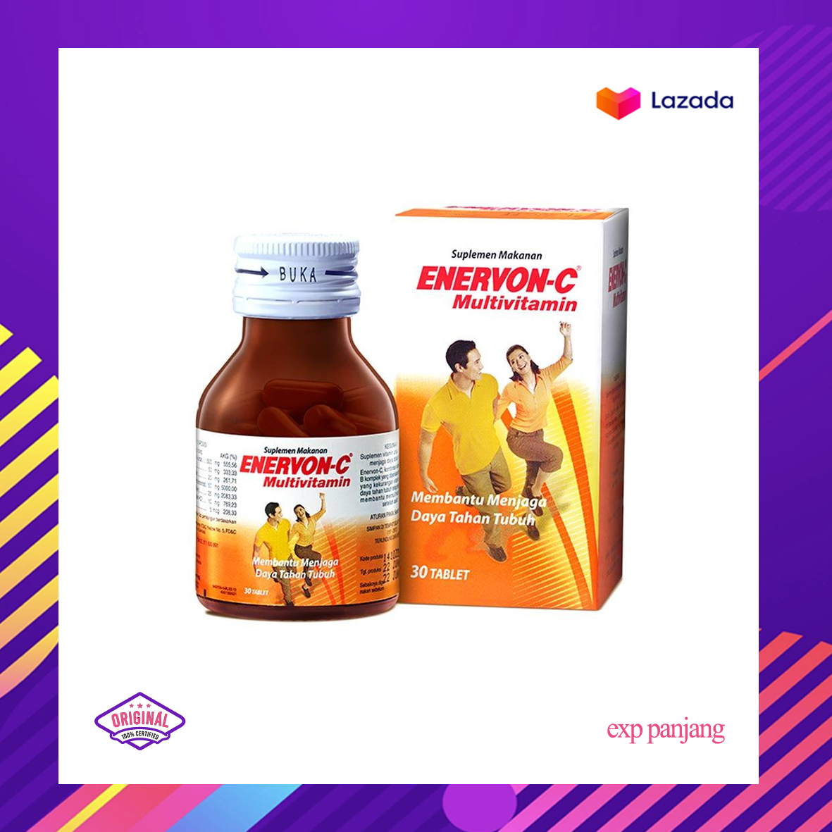 ENERVON C merupakan suplemen makanan dengan kandungan multivitamin seperti Vitamin C, Vitamin B1, Vitamin B2, Vitamin B6, Vitamin B12, Vitamin D, Niacinamide, Kalsium pantotenat dalam bentuk tablet salut. Suplemen vitamin ini berguna untuk membantu menjaga daya tahan tubuh.