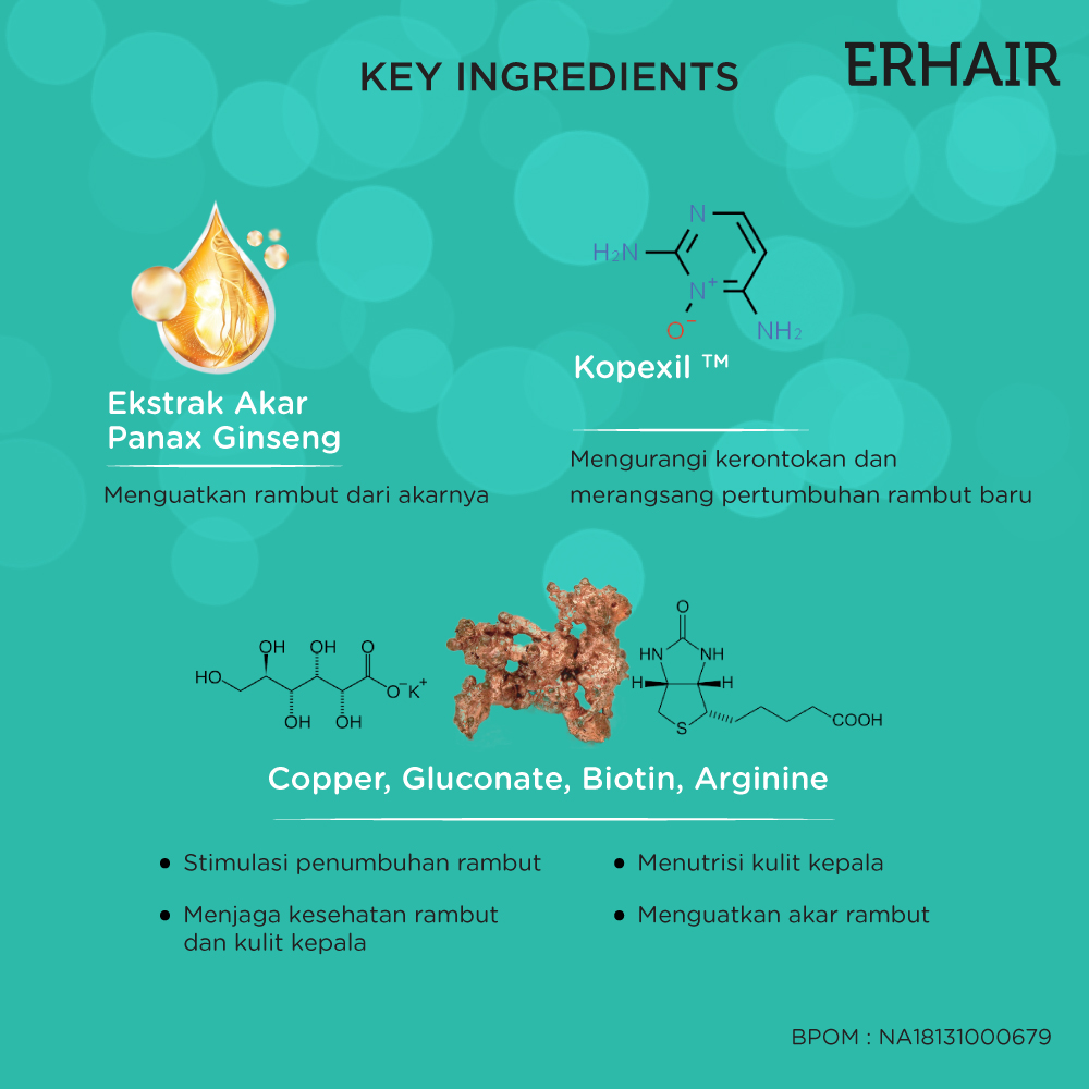 Dengan kandungan Kopexil dan Panax Ginseng Root Extract untuk mengurangi rambut rontok dan regenerasi rambut dengan cara meningkatkan sirkulasi darah dan menutrisi rambut.