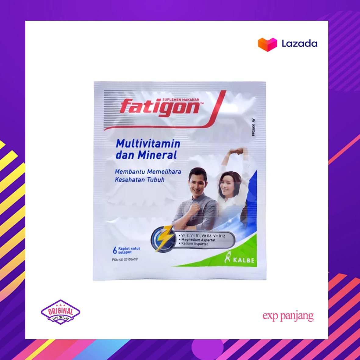 Fatigon adalah multivitamin yang terdiri dari kombinasi vitamin B1, B6, B12, vitamin E, serta mineral, Kalium, dan Magnesium Aspartat yang membantu memelihara kesehatan untuk menjaga kondisi tubuh.