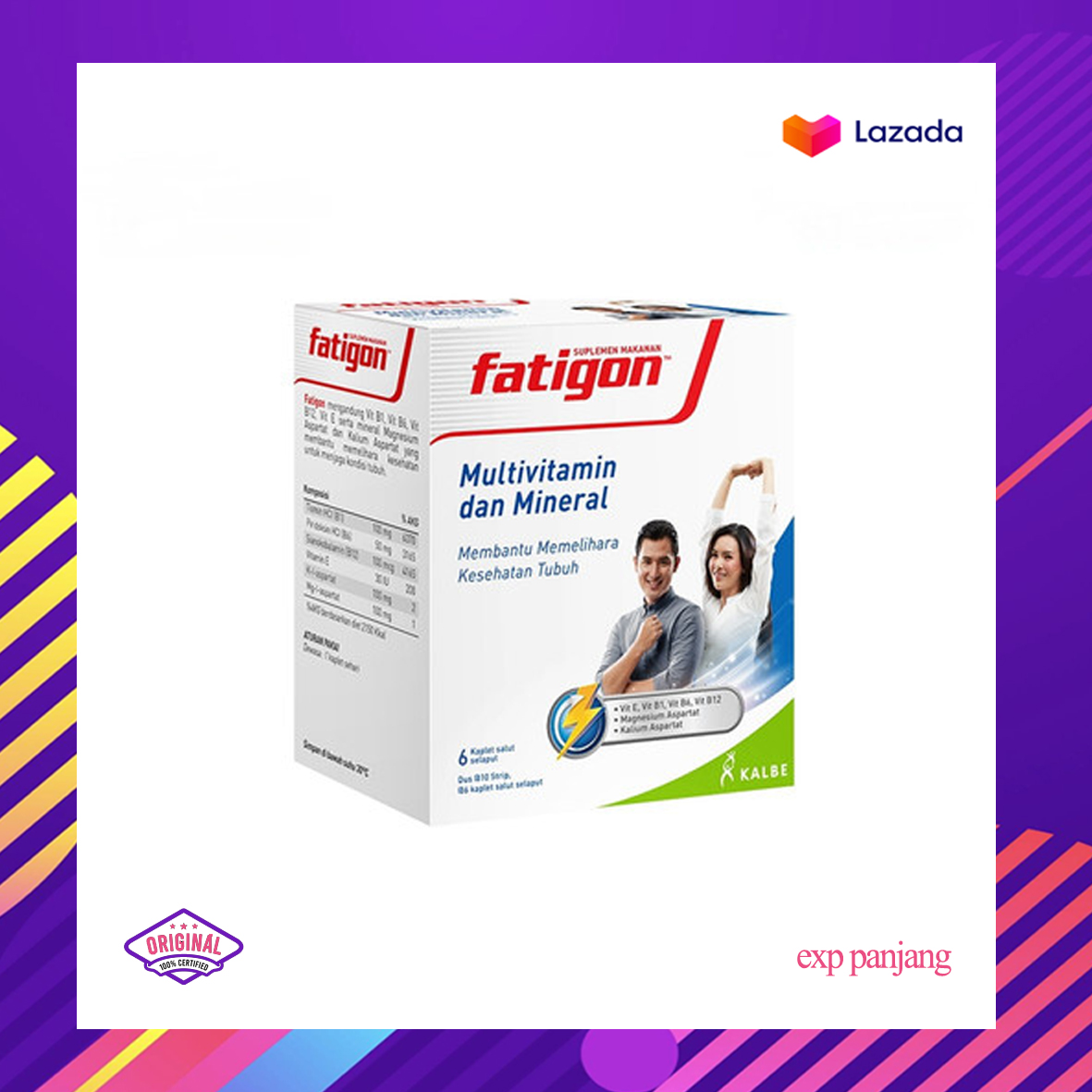 Fatigon adalah multivitamin yang terdiri dari kombinasi vitamin B1, B6, B12, vitamin E, serta mineral, Kalium, dan Magnesium Aspartat yang membantu memelihara kesehatan untuk menjaga kondisi tubuh.