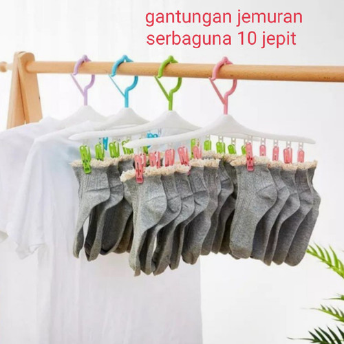 Gantungan Jemuran 10 Jepit - Serbaguna Hanger Serbaguna 10 jepit adalah hanger dengan 10 anak jepitan. Sangat praktis dipakai untuk jemuran kaos kaki, celana dalam, bra, pakaian bayi, sarung tangan. Irit tempat, dengan hanger ini tali atau tiang jemuran bisa gantung lebih banyak pakaian.Kepala jepitan bergerigi halus, jepitnya kuat, gak mudah lepas meski ditiup angin. Tidak mudah jatuh meski diitiup angin.Material : Plastik