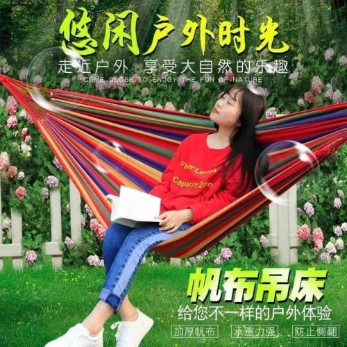 Ready warnasalur birusalur merahsalur hijauHammockBuat suasana liburanmu semakin santai dan rileks dengan menggunakan Hammock. Hammock berupa tempat tidur gantung ini cocok banget jadi teman saat liburan. Pastinya bersantai saat liburan jadi semakin terasa nikmatnya.Kamu tinggal mengikatkan Hammock ini di pohon, tiang, atau penyangga kuat lainnya. Hammock ini juga mudah banget kamu bawa kemana-mana, karena terbuat dari kain yang ringan. Jadi buat kamu yang liburan ke pantai atau ke hutan sekalipun, nggak masalah dengan membawa Hammock ini.- Material : Canvas- Load Capacity : 120kg- Type : Warm Weather- Size : approx 200 x 80cm