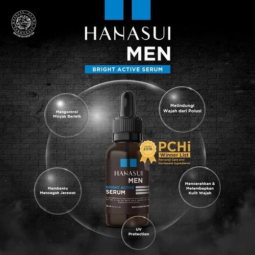Hanasui Men Bright Active SerumSerum is a facial care product that is rich in nutrients, and is suitable for those who often do activities outside the home and are directly exposed to air pollution and sunlight.Hanasui Men Bright Active Serum helps provide solutions, especially for men, a daily serum for active men who often do outdoor activities, containing pollustop®, Niacinamide, Vitamin C, and Glycerin which not only help the skin deal with pollution but can also brighten the face and control excess oil.Benefit :• Brighten & Moisturize facial skin• Protects the face from pollution• Controls excess oil• Helps prevent acne• UV ProtectionMain Ingredients & Benefits:• Pollustop : Protects the face from pollution & UV Protection• Niacinamide : Brightens the face and controls excess oil• Vitamin C: helps prevent acne and helps disguise acne scars• Glycerin:Moisturizing skinNet : 20 MLBPOM NA : 18201900609