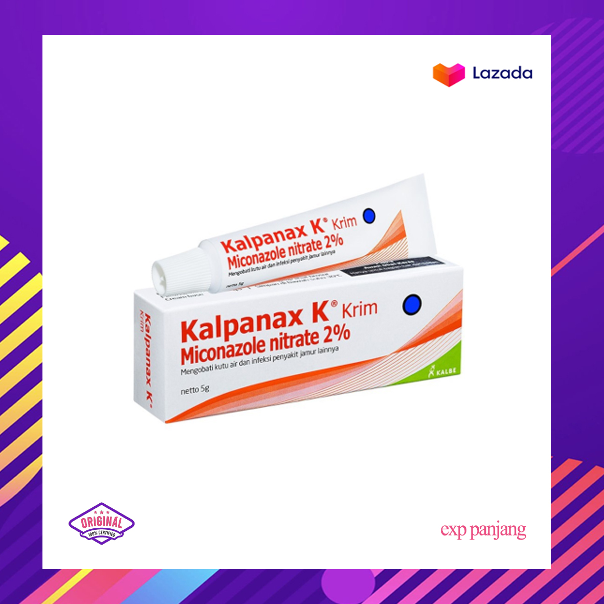 KALPANAX K CREAM mengandung Miconazole yang merupakan obat anti jamur golongan imidazole, digunakan untuk mengobati penyakit kulit akibat infeksi jamur. Kerjanya yang sangat cepat, dingin di kulit, tidak membuat kulit terkelupas, aman digunakan pada daerah sensitif. Sangat aman digunakan untuk anak-anak, aroma bunga jasmine, dan tidak lengket di kulit.
