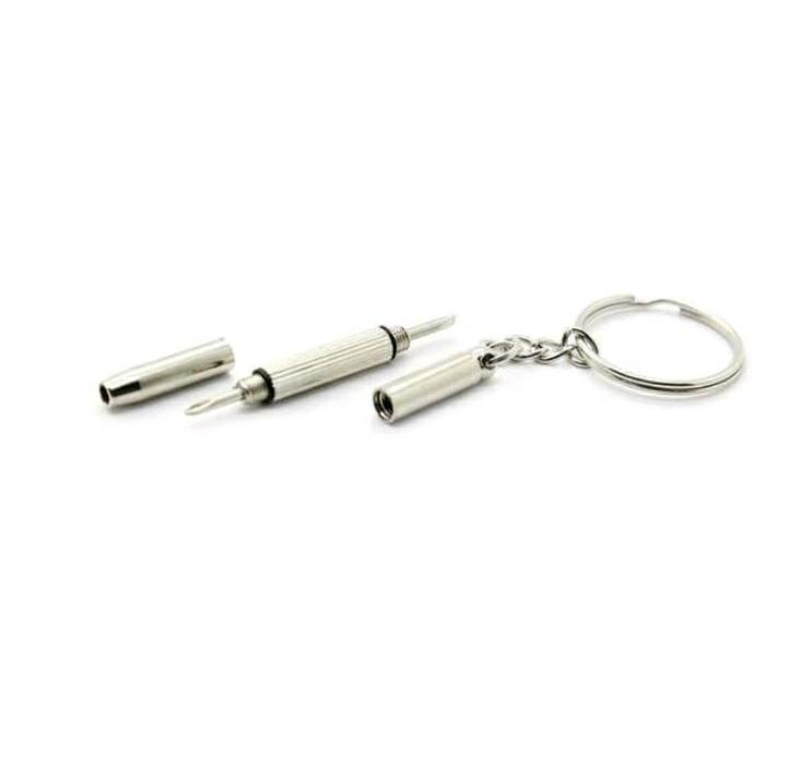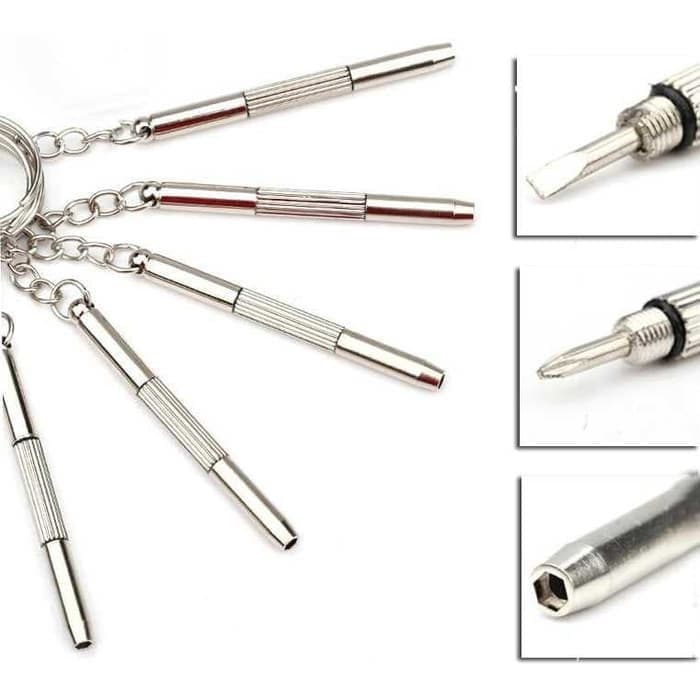 Gantungan Kunci Stainless Bentuk Mini 4in1: 1. Obeng Bunga (Phillips) 2. Obeng Minus (Flat Head) 3. Obeng Segi Enam (Hex) Tampil unik dan menawan, berukuran mini, ringan, mudah dikantongi dan tentunya sangat bermanfaat di saat penting untuk memperbaiki gadget kecil seperti: 1. Kacamata 2. Jam tangan 3. Handphone 4. Kalkulator 5. Mainan 6. dll Mini 4 in 1 Stainless Steel Screwdriver Keychain Precision Eyeglass Repair Tool Mini Stainless Steel Multifunction Screwdriver with Keychain With slotted screwdriver, phillips screwdriver & hex screw driver Suitable for repairing glasses Can be used as a keychain DEPTH 5 mm HEIGHT 60 mm WIDTH 5 mm Material Zinc Alloy Gantungan Kunci Unik ini sangat cocok untuk dipakai sendiri atau dijadikan hadiah / souvenir, baik acara pernikahan, perayaan ulang tahun, hadiah prestasi karyawan dll. Pernahkah Anda membutuhkan obeng disaat mendesak untuk membongkar peralatan yang sedang Anda gunakan saat beraktifitas? Peralatan seperti mouse, jam tangan, mp3 player cenderung menggunakan sekrup ukuran kecil dan membutuhkan obeng untuk membukanya. Kini Anda dapat membawa obeng kecil kemana saja dengan bentuk gantungan kunci yang mini, dan menggunakannya saat diperlukan. Bentuknya sangat kecil dan ringkas, memudahkan Anda untuk membawanya kemana saja, namun dibalik itu tersimpan fungsi yang besar terutama ketika Anda ingin membongkar peralatan sehari-hari Anda. Bentuk obeng yang kecil dapat Anda manfaatkan untuk membuka baut-baut yang mengencangkan peralatan Anda seperti mouse, mp3 player, jam tangan, dan lain sebagainya. Obeng mini ini terdiri dari kepala jenis plus dan minus, dengan ukuran 1.7 mm dan juga tersedia pembuka mur dengan diameter 2.6 mm berbentuk segi enam. Obeng kecil ini didesain dengan gantungan kunci sehingga memudahkan Anda untuk dapat membawanya kemana saja. Panjang obeng pun hanya 53 mm saja