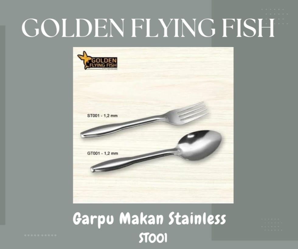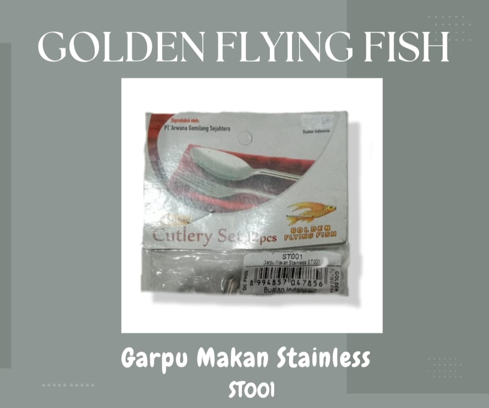 Garpu Makan Food Grade. Garpu stainless steel ST001 - Golden Flying Fish. Food grade, kuat, tahan lama, tebal (1,2mm). Tidak mengubah rasa atau menimbulkan reaksi kimia pada makanan. Diproduksi di Indonesia dengan material stainless steel ber-SNI (Sertifikat Nasional Indonesia).