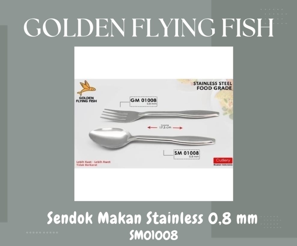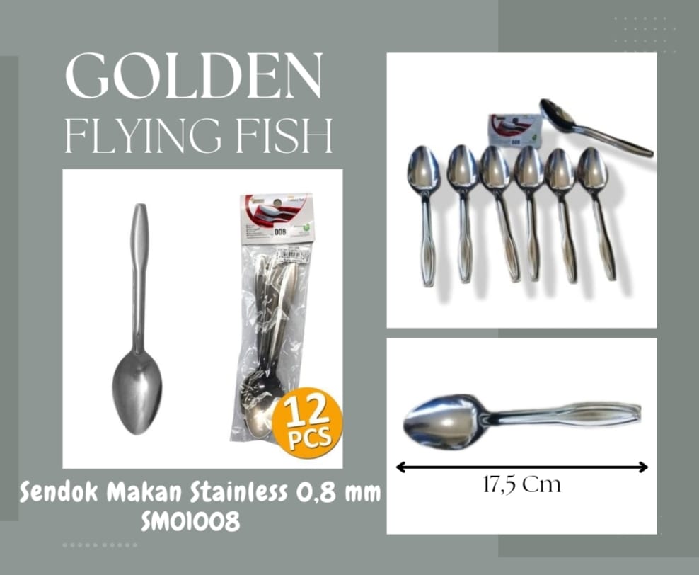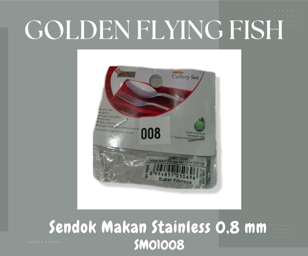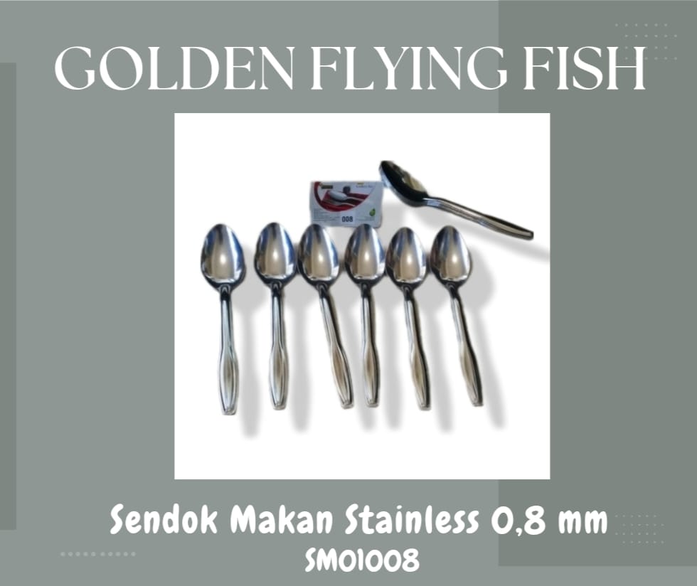 Sendok Makan Food Grade. Sendok stainless steel SM01008 - Golden Flying Fish. Food grade, kuat, tahan lama, tebal (0.8mm). Tidak mengubah rasa atau menimbulkan reaksi kimia pada makanan. Diproduksi di Indonesia dengan material stainless steel ber-SNI (Sertifikat Nasional Indonesia).