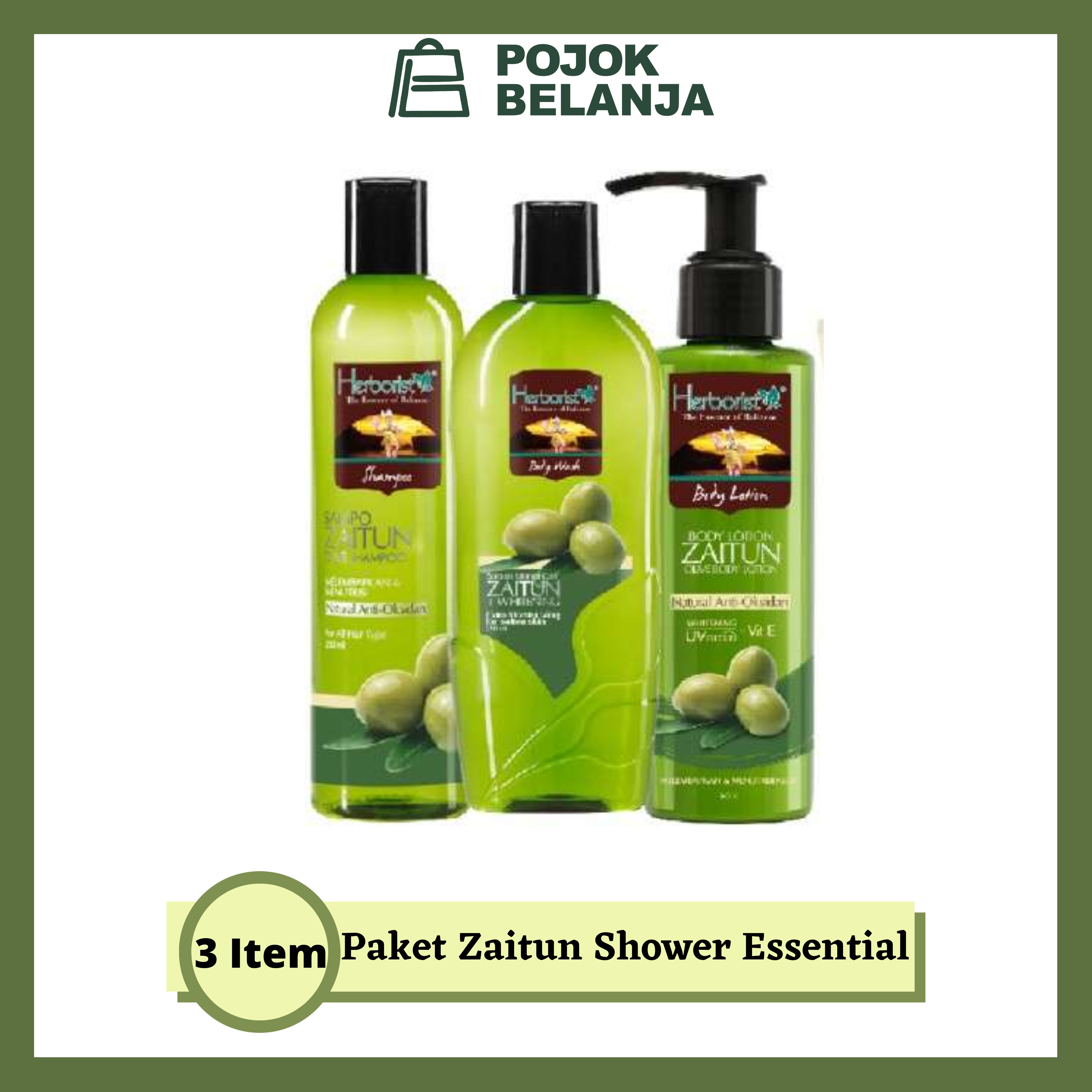 Paket Herborist Zaitun Shower Essential ( Body Wash Zaitun 250 ml , Shampoo Zaitun 250 ml , Body Lotion Zaitun 145 ml ) | Pojokbelanja