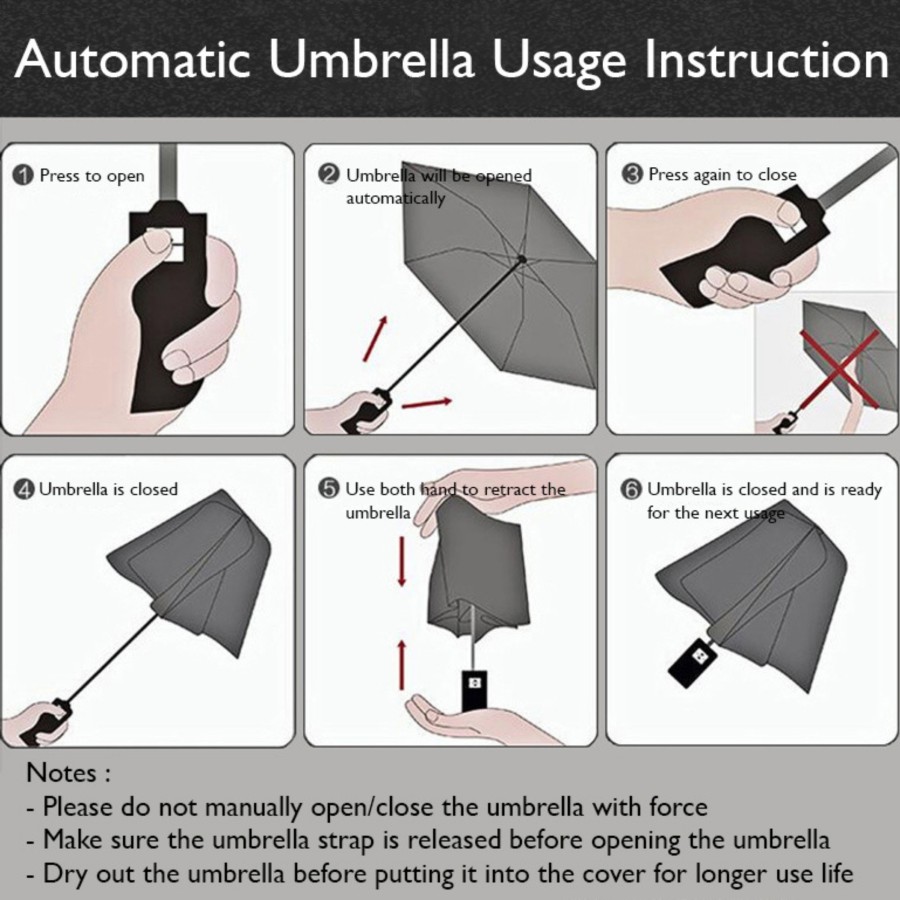 Payung Lipat Otomatis / Payung Otomatis / Payung Lipat UV / Payung UV / Payung Anti UVKelebihan :- Rangka besi yang kuat sehingga tidak mudah rusak terkena angin- Tiang payung dilapisi lapisan anti karat- Bagian dalam payung menggunakan bahan kain anti UV- Tombol otomatis untuk membuka payung hanya dengan 1 klikVarian yang tersedia :- Putih- Hitam- Navy- Hijau- Pink- Biru Muda