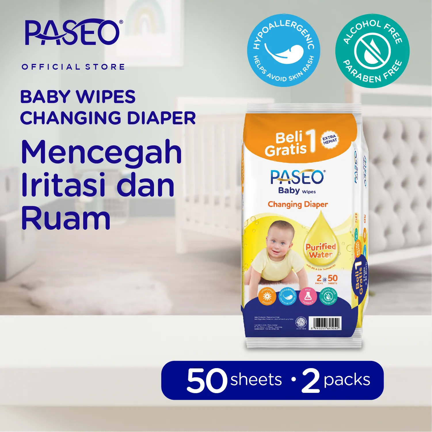 Isi terdiri dari: 2 Packs Paseo Baby Tissue Basah 50 Sheets