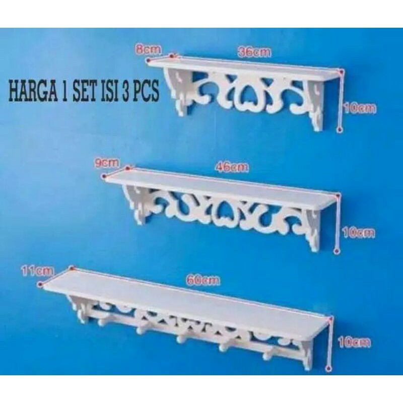 Uk rak :Dari yg kecil s/d besar (panjang x lebar x tinggi )1. 36 cm x 8 cm x 10 cm2. 46 cm x 9 cm x 10 cm3. 60 cm x 11 cm x 10 cmFurniture yang bisa mempermanis rumah dengan yang sangat murah.Apabila order harap cantumkan varian yg diinginkan dikolom keteranganBarang sebelum di kirim sudah melalui proses pengecekanMembeli=SETUJUTerima Retur & komplain degan Video unboxingTerimakasih.