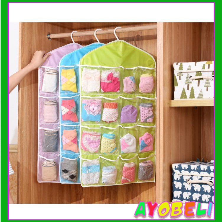 ✓ Pouch Gantung 16 Sekat Pouch Hanging Organizer 16 Sekat Korean Set Tempat Celana Dalam Gantung adalah solusi buat anda yang ingin menyimpan barang atau celana dalam jadi tersimpan rapi dan mudah diambil saat hendak dipakai.✓ Pouch terdiri dari 16 sekat transparan, tiap sekat dapat di isi 3-4 pcs celana dalam.✓ Pouch dapat digantung ke hanger, mumudahkan untuk digantung di dalam lemari.✓ Bagian atas terdapat lobang untuk hanger.✓ Selain untuk tempat panties, pouch juga dapat digunakan untuk tempat menyimoan aksesoris.