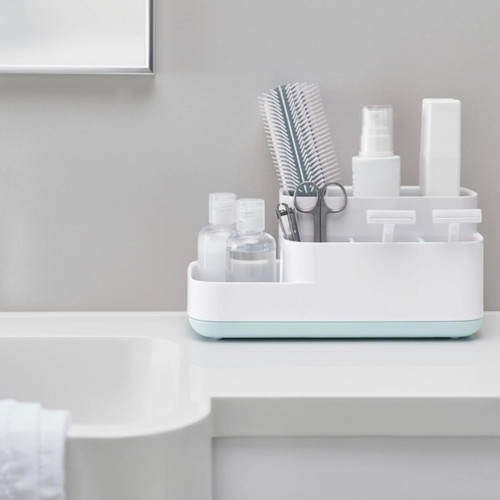 dibagi menjadi berbagai kompartemen dengan berbagai bentuk, ukuran dan kedalaman - sempurna untuk menyimpan barang-barang kecil seperti gunting, kuas, deodoran, pisau cukur dan make up. Desain hemat-ruang sangat cocok untuk merapikan permukaan kamar mandi Anda dan membuatnya lebih mudah bagi Anda untuk menemukan apa yang Anda cari. Kamar ini juga memiliki alas non-slip dan terlihat bagus di rak kamar mandi apa pun.