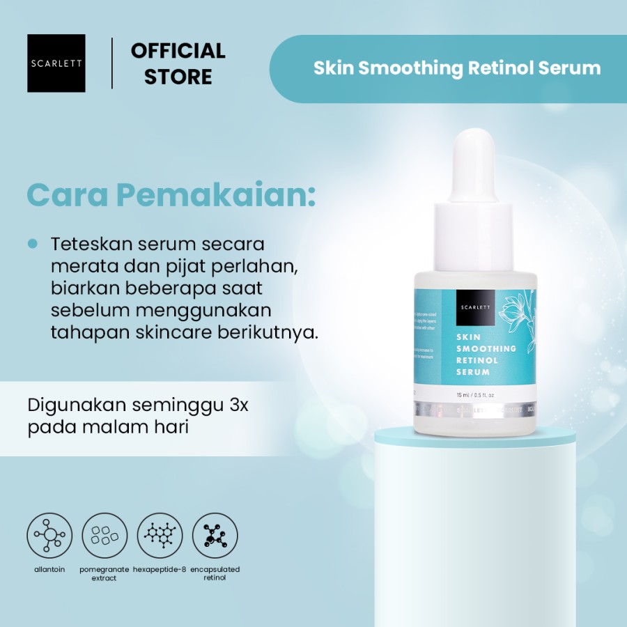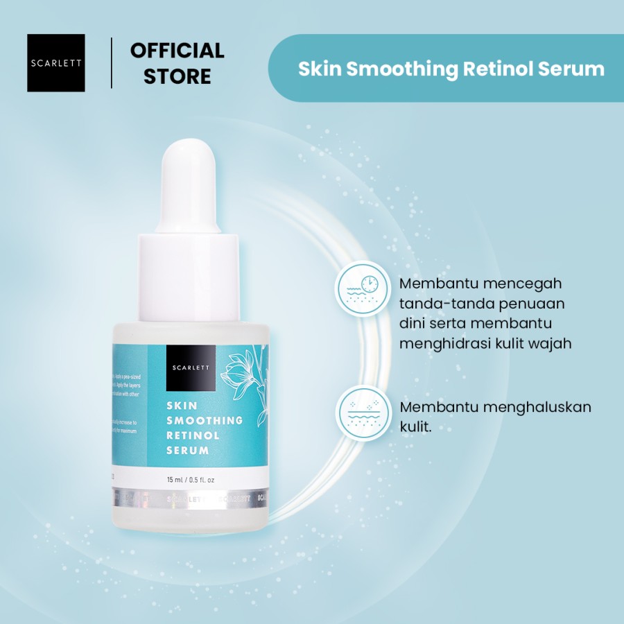 Scarlett Whitening Retinol Serum Size 15MLManfaat :RetinolMencegah tanda penuaan dan menyamarkan garis halus yang telah munculMeningkatkan proses regenerasi kulit sehingga sel kulit mati terangkat dan kulit terlihat lebih cerah serta halusMembantu menyamarkan tampilan pon-porbesarMembantu meningkatkan produksi Kolagen dan elastin sehingga kulit terasa lebih kenyal