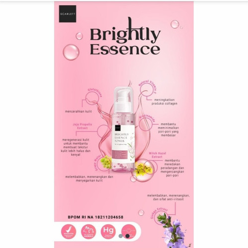 Scarlett Whitening Essence Toner Brightly mengandung VITAMIN C, GLUTATHIONE, WITCH HAZEL EXTRACT,JEJU PROPOLIS EXTRACT, ALLANTOIN, NIACINAMIDE, GRAPE WATER, yang bermanfaat:1) Vitamin C meningkatkan produksi kolagen2) Glutathione mencerahkan kulit3) Witch Hazel Extract membantu meredakan peradangan dan mengencangkan pori-pori4) Jeju Propolis Extract meregenerasi kulit untuk membantu membuat tekstur kulit lebih halus dan kenyal5) Allantoin melembabkan, menenangkan, dan sifat anti-iritasi6) Niacinamide membantu meminimalkan pori-pori yang membesar7) Grape Water melembabkan, menenangkan dan menyegarkan kulitCara Pakai:- Pastikan tangan dalam kondisi bersih-Tuangkan toner essence ke telapak tangan lalu tepuk-tepuk secara perlahan ke kulit wajah- Atau bisa tuangkan toner essence secukupnya pada kapas, kemudian mulai usapkan kapas yang telah dibasahi toneressence hingga ke seluruh wajah