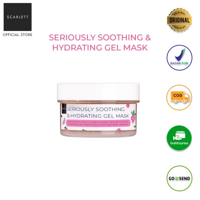 Scarlett Herbalism Mugwort Mask dapat digunakan untuk merawat kulit berminyak, pori-pori besar, berjerawat dan berkomedo. Di dalam Herbalism Mugwort Mask terdapat kandungan Mugwort Extract, Vitamin C, Glutathione, Niacinamide, Bamboo Charcoal, Allantoin, Chlorophyllin, Green Tea Powder yang bermanfaat sebagai:1) Mugwort Extract mempunyai efek membantu menenangkan kulit2) Vitamin C membantu meningkatkan produksi kolagen3) Glutathione and Niacinamide membantu menyamarkan noda pada kulit dan mencerahkan warna kulit4) Bamboo Charcoal efektif dalam membantu membersihkan kulit5) Allantoin membantu menjaga kelembapan dan kelembutan6) Chlorophyllin and Green Tea Powder sebagai antioksidan yang baik untuk anti-agingScarlett Seriously Soothing & Hydrating Gel Mask dapat digunakan untuk merawat kulit kering, kusam, iritasi, dan sensitif. Di dalam Scarlett Seriously Soothing & Hydrating Gel Mask terdapat kandungan Niacinamide, Vitamin C, Grape Fruit Water, Seven Berry Extract, Ginseng Extract, Centella Asiatica, Rose Flower Water, Allantoin yang bermanfaat sebagai:1) Niacinamide membantu mencerahkan kulit2) Vitamin C membantu meningkatkan produksi kolagen3) Grape Fruit Water membantu menjaga lapisan luar kulit terhidrasi4) Seven Berry Extract sebagai antioxidant pada kulit untuk membantu melawan radikal bebas yang menyebabkan penuaan dini seperti kerutan, kusam dan warna kulit tidak merata5) Ginseng Extract membantu menyamarkan kerutan secara nyata6) Centella Asiatica Extract merupakan antioksidan yang baik7) Rose Flower Water dapat membantu mengurangi kemerahan dan bengkak pada kulit8) Allantoin membantu menjaga kelembapan dan kelembutan kulitCara Pakai :- Lakukan skin test terlebih dahulu selama 10-15 menit dengan cara aplikasikan masker ke kulit belakang telinga atau siku bagian dalam.