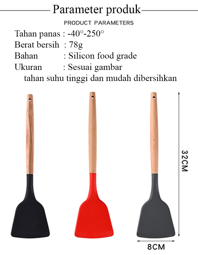 Sodet Silikon Gagang Kayu Spatula Silikon Gagang KayuSodet Silikon Gagang Kayu Tahan Panas Spatula Sutil Teflon SendokSpatula Silikon Gagang Kayu Sodet Silikon Sutil Silikon Tahan PanasHobi memasak tapi tidak ingin kuali / teflon tergores dan berisik saat memasak, kami punya solusinya. Gunakanlah sendok goreng yang terbuat dari silicon food grade ini memiliki tepi yang tumpul dan halus sehingga tidak akan menggores kuali/teflon anda dan tidak akan berisik saat memasak.Keunggulan prodk- Desain yang cantik dan modern- Memiliki banyak warna- Memiliki tepi yang tumpul dan halus sehingga panci/kuali tidak tergores- Tidak berisik saat memasak- Dengan bahan silicon foodgrade yang dapat tahan panas hingga 250°SpesifikasiTahan panas : -40 sampai 250°Berat bersih : 78gBahan : silicon food gradeUkuran : 8cm x 32cm