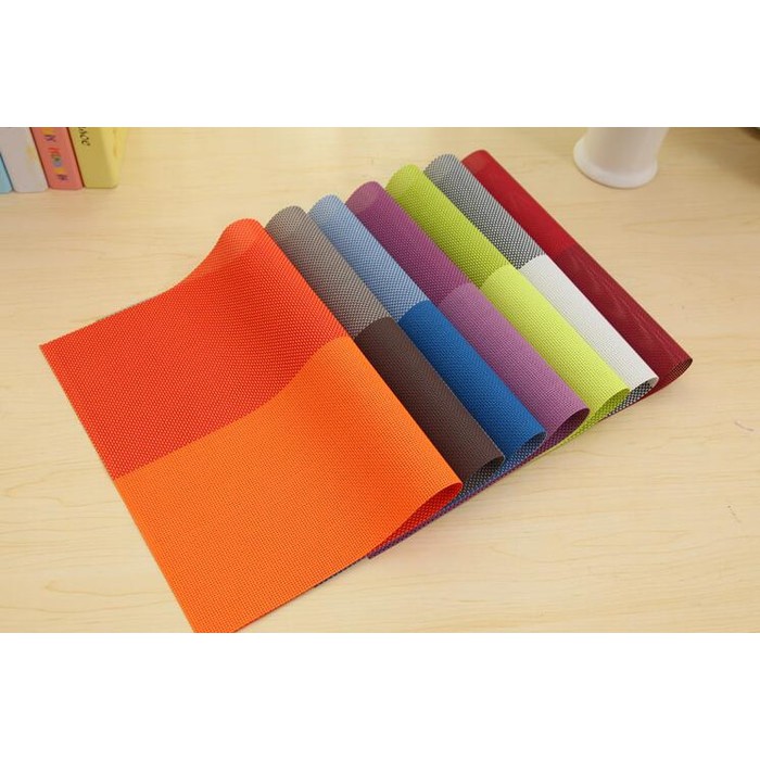 eady warnahitambiruorangehijauungumerahTatakan piring cantik dengan kombinasi warna menarik. Cocok untuk pelengkap meja makan, kesannya modern. Dari bahan pvc ringan, tahan panas.Size : 45 x 30 cmMotif : Kotak-kotak