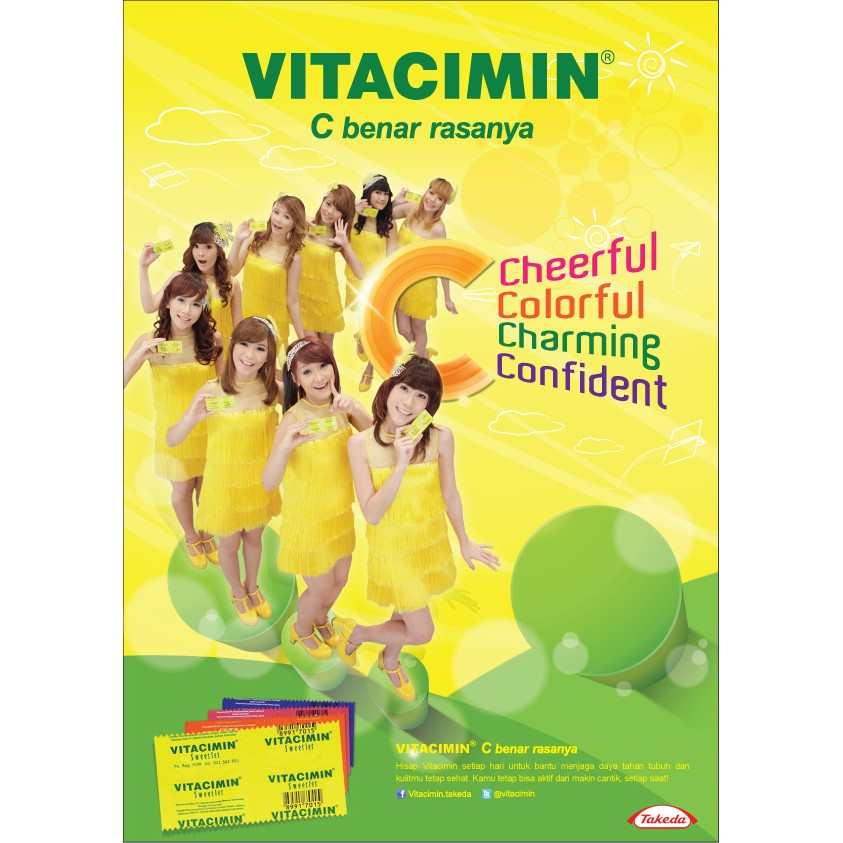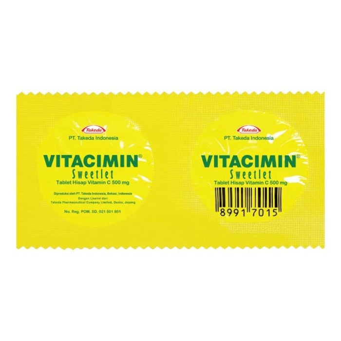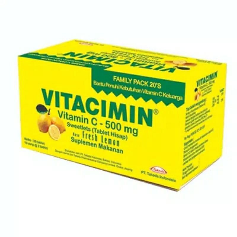 Vitacimin merupakan tablet hisap yang mengandung Vitamin C - 500 mg berwarna kuning dan memiliki rasa lemon yang menyegarkan. Vitacimin berfungsi sebagai suplemen yang bagus untuk memenuhi kebutuhan Vitamin C agar tubuh selalu sehat dan segar.