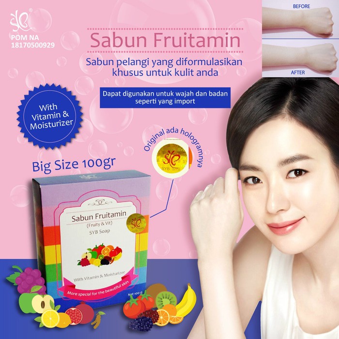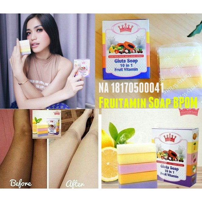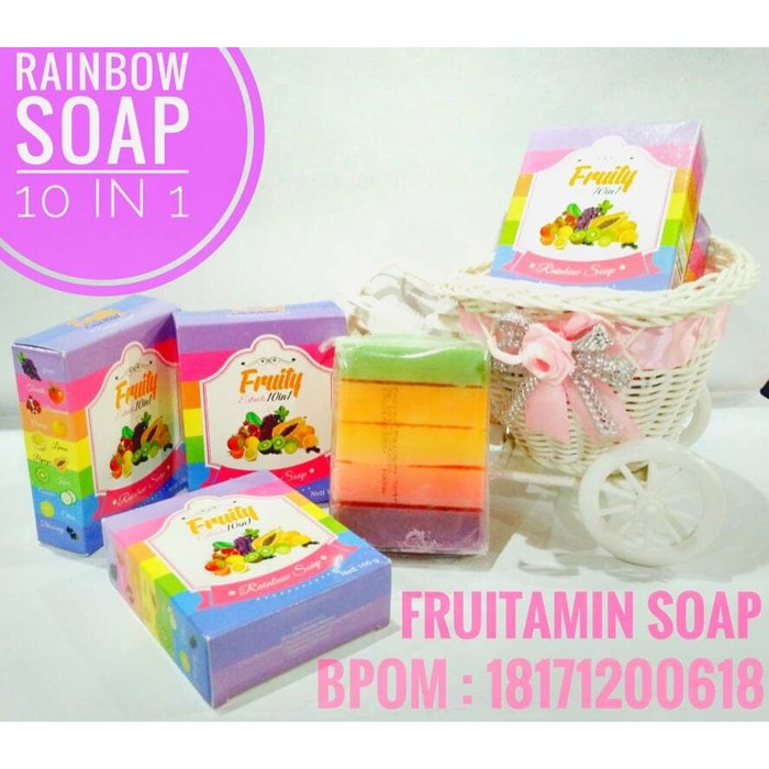 Fruitamin Soap dari 10 bahan buah dalam 1 sabun 5 warna yg mengintegrasikan seluruh kandungan yg terkonsentrasi dari ekstrak natural buah, formula 10 kali lebih efektif daripada formula yg lama.