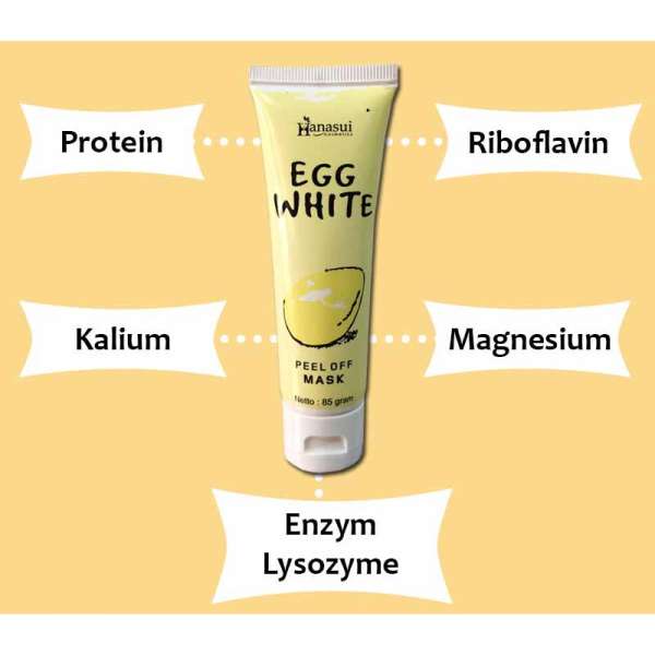Hanasui Masker Egg White  Komposisi Dalam Masker Egg White. Masker egg white baik digunakan untuk perawatan wajah. Kandungan dalam masker egg white menggunakan bahan alami yang tidak menimbulkan efek samping berbahaya untuk tubuh. Beberapa kandungan yang berada dalam setiap kemasan masker egg white diantaranya, kalium, magnesium, protein, riboflavin, kaya asam amino serta memiliki kandungan enzim lysozyme.  Manfaat Masker Egg White :  1.Membantu Regenerasi Sel Kulit Mati Setiap sel pada tubuh memiliki masa hidupnya sendiri, seperti sel kulit. Sel pada kulit juga dapat mati dan kemudian harus digantikan dengan sel kulit yang baru. Proses pergantian sel kulit atau biasanya disebut dengan regenerasi sel ini terkadang terhambat. Untuk membantu proses regenerasi sel diperlukan protein seperti yang terkandung di dalam masker egg white. Dengan suplai protein yang mencukupi pada wajah, regenerasi sel dapat berjalan dengan baik, sehingga sel kulit mati dapat digantikan dengan sel baru.  2. Mengencangkan Wajah Protein dalam masker egg white dapat membantu proses regenerasi sel wajah. Regenerasi yang terjadi pada sel kulit pada wajah dapat membantu menghilangkan kerutan pada wajah. Sehingga dapat menjadikan kulit wajah menjadi kencang dan bebas dari kerutan. Kulit wajah menjadi terlihat lebih awet muda.  3. Menjaga Kelembapan Kulit Masker egg white mengandung berbagai kandungan, termasuk kandungan yang terdapat di dalam putih telur. Salah satu kandungannya yakni kalium, yang dapat membantu menyegarkan kulit. Selain kulit menjadi lebih segar, kelembapan kulit juga menjadi terjaga. Kulit menjadi segar, lembap dan juga tidak kering.  Menyehatkan Kulit Wajah Mencegah Penuaan Dini Pada Wajah Elastisitas Kulit Terjaga Mengurangi Minyak Pada Kulit Wajah Mencegah Terjadinya Peradangan Pada Kulit Wajah Menghilangkan Flek Hitam Menghilangkan Komedo Menghaluskan Kulit Wajah Mencerahkan Kulit Wajah  Cara Pemakaian Masker Putih Telur Asli (Egg White Peel Off Mask BPOM) : 1. Cuci bersih muka lalu keringkan. 2. Oleskan Egg White Peel off Mask pada wajah secara merata. 3. Diamkan 15-20menit. 4. Cara mengangkat dengan mengelupas dari bagian bawah ke atas.  Gunakan 2-3 kali seminggu.Â